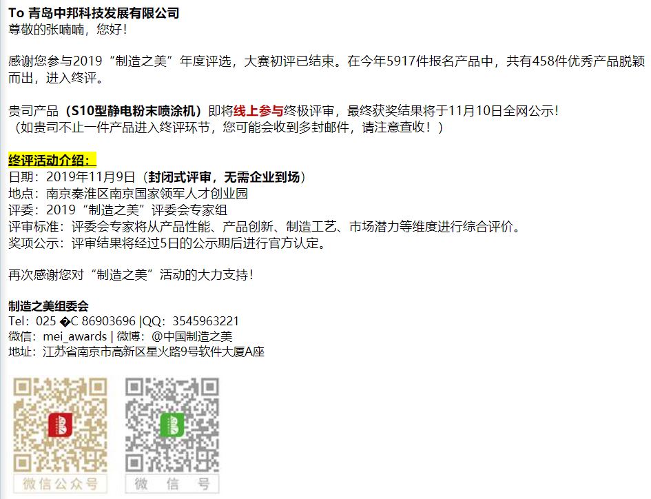 中邦S10型噴涂機進入中國制造之美2019年度大賽終評!